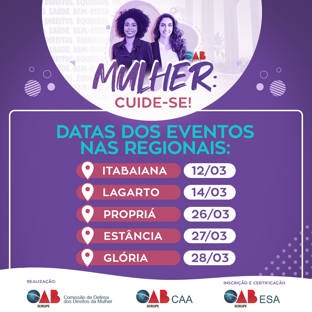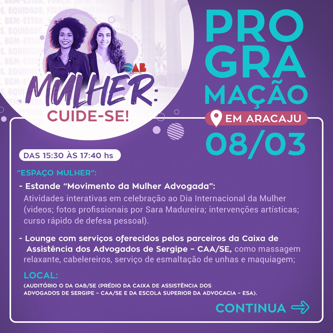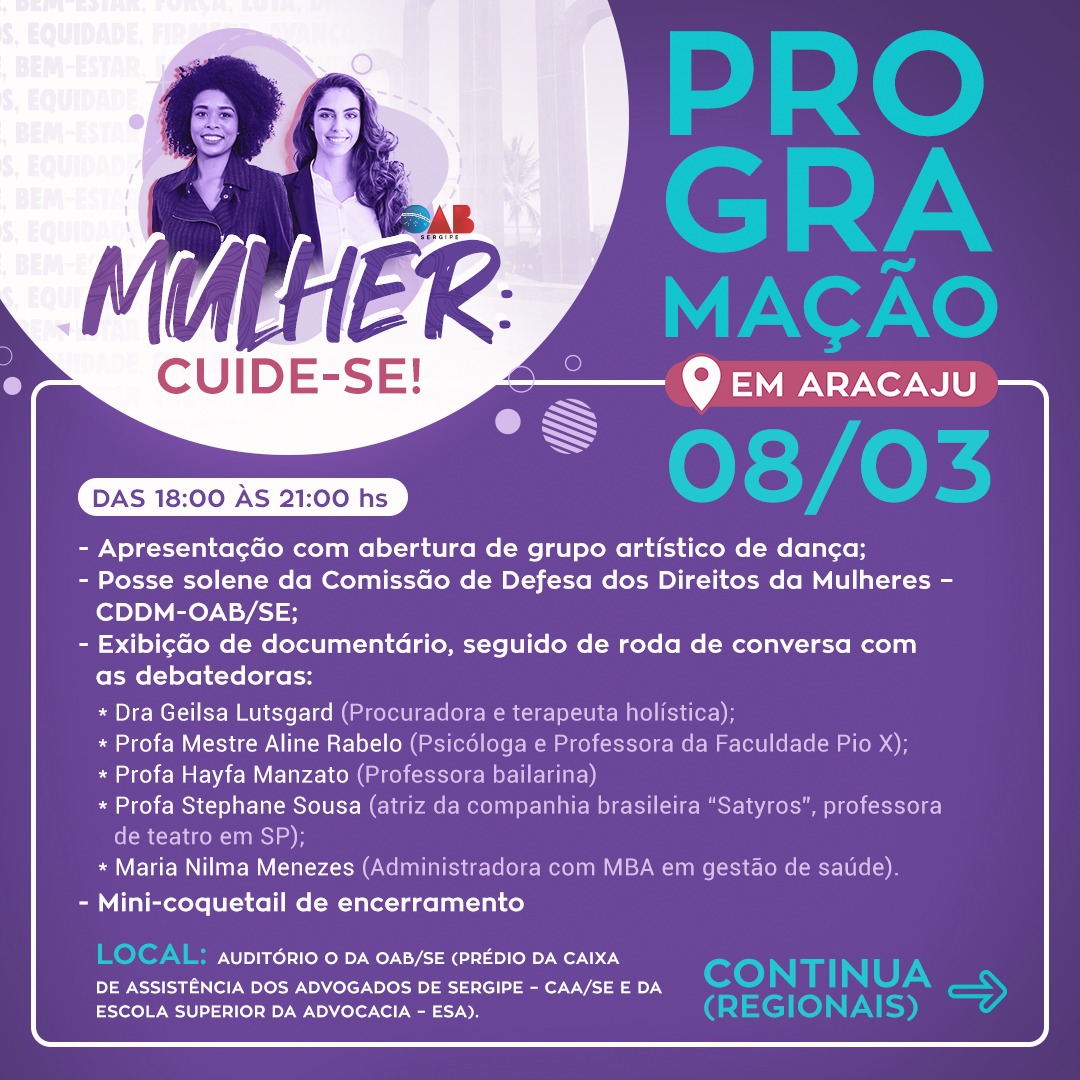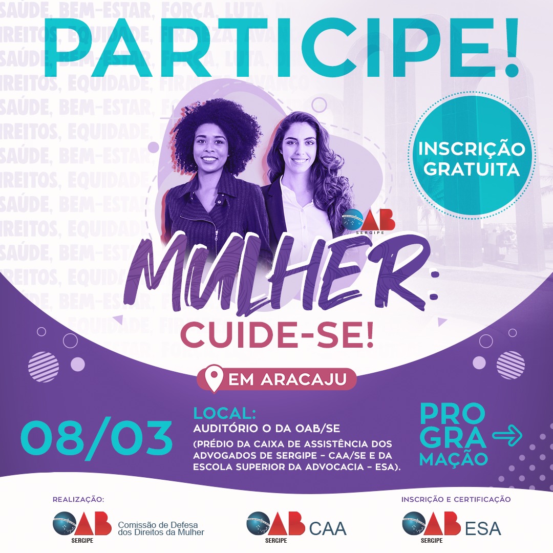 A Ordem dos Advogados do Brasil – Seccional Sergipe, por meio da Comissão de Defesa dos Direitos da Mulher, em parceria com a CAA-SE, ESA/SE e apoio do Conselho da Jovem Advocacia, lança o evento “Mulher: Cuide-Se!”, em alusão ao Dia Internacional da Mulher. A celebração ocorrerá na capital em no dia 08 de março, quando é celebrado o Dia Internacional da Mulher, e segue uma agenda de datas consequentes em cada regional da OAB/SE, como avanço no propósito da interiorização da entidade.