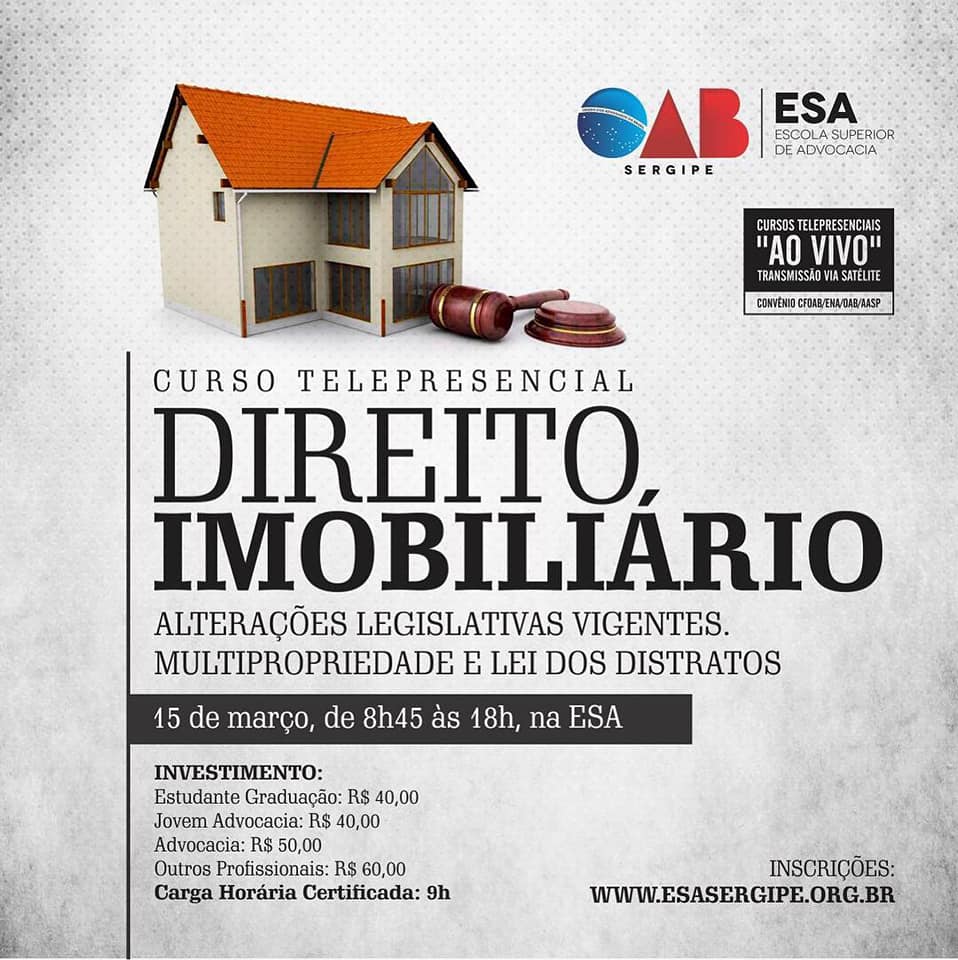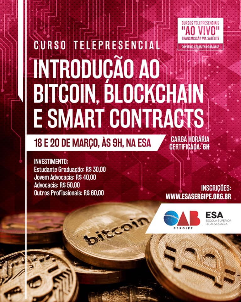 Neste mês, a Ordem dos Advogados do Brasil, em Sergipe, através da Escola Superior de Advocacia realiza, em Aracaju, mais duas capacitações telepresenciais. Nesta sexta-feira, 15, um dos cursos abordará alterações legislativas vigentes no Direito Imobiliário, Lei dos Distratos e multipropriedade. Nos dias 18 e 20, os temas serão bitcoin, blockchain e smart contracts.