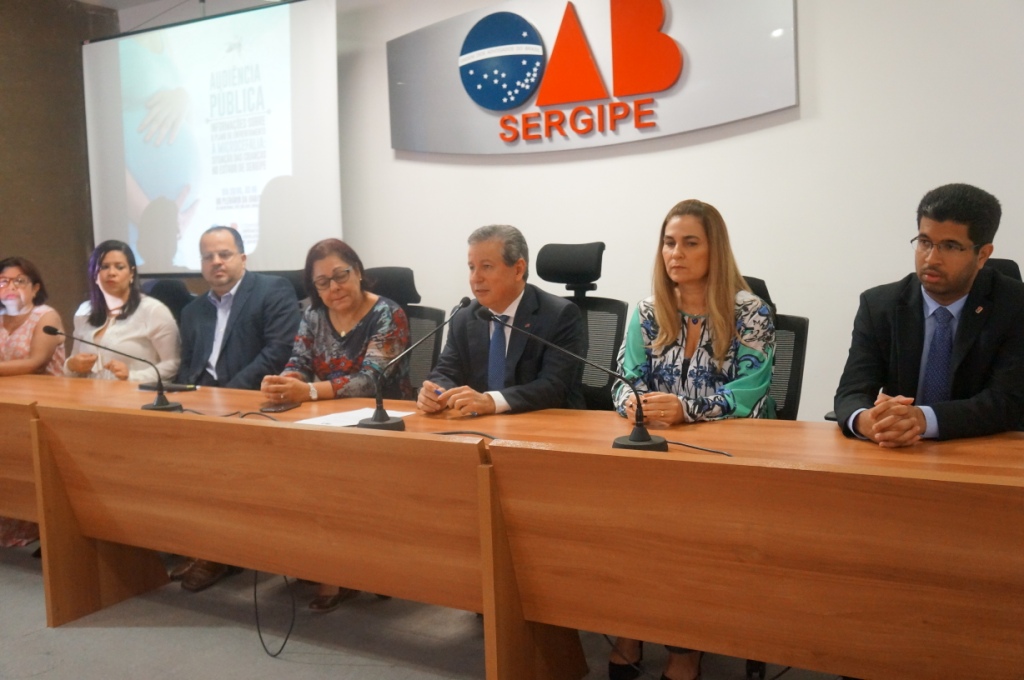 A Ordem dos Advogados do Brasil – Seccional Sergipe realizou nesta segunda-feira, 30, uma audiência pública com o tema: “Informações sobre o plano de enfrentamento à microcefalia: situação das crianças no estado de Sergipe”. Em fevereiro, Sergipe contava um número de 192 casos de microcefalia. Desses casos, ainda não havia se confirmado se havia sido infecção por zika vírus. O encontro contou com a participação dos representantes da Maternidade Nossa Senhora de Lourdes; Hospital Universitário; Secretarias de Saúde do Estado e do Município de Aracaju e Secretaria de Assistência Social do Estado, Promotoria da16ª Vara da Infância e da Juventude, Defensoria Pública, Sociedade Médica de Sergipe, Procuradoria Geral do Estado, Conselho Regional de Fisioterapia, Conselho Tutelar, INSS, APAE, Sociedade de Pediatria de Sergipe, Instituto Brasileiro de Direito de Família em Sergipe, Comissão de Defesa dos Direitos da Pessoa com Deficiência da OAB/SE, Comissão de Direitos Humanos da OAB/SE, Representantes do Conselho Regional de Psicologia, Conselho Municipal dos Direitos da Criança de São Cristóvão, Conselho Regional de Fisioterapia, assessoria parlamentar da deputada Ana Lúcia que representa a Frente parlamentar da criança e adolescente da Assembleia Legislativa.