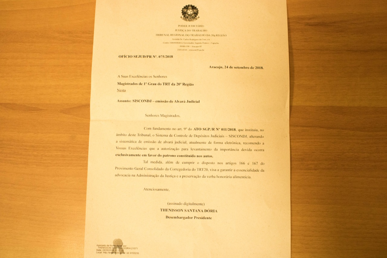 OAB/SE solicita ao TRT20 expedição de alvarás em nome de advogado ou advogada